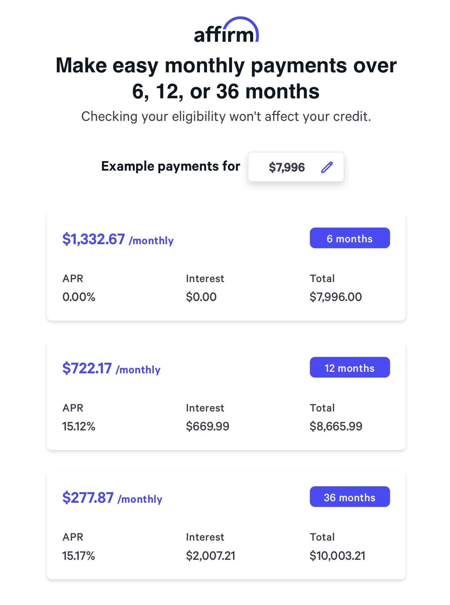 †Payment options are offered by Affirm and are subject to eligibility check and may not be available in all states. California residents: Affirm Loan Services, LLC is licensed by the Department of Business Oversight. Loans are made or arranged pursuant to California Financing Law license 60DBO-111681.