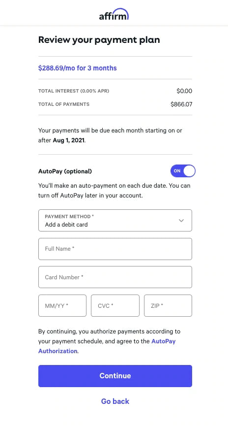 Select Affirm at checkout, then enter a few pieces of info for a real-time decision.